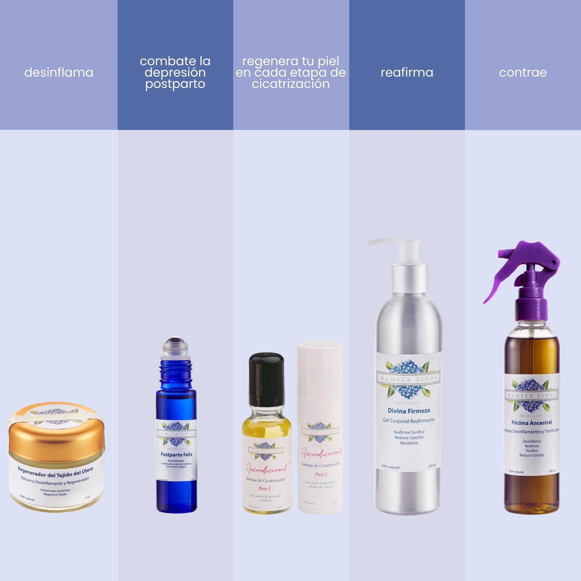 El Kit Cesárea combina 5 fórmulas naturales diseñadas para sanar, reafirmar y regenerar la piel, mientras brindan alivio y bienestar emocional.
